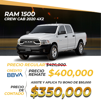 Aplica para RAM1500 CABINA REGULAR 2020 con precio de $350,000. Válido con BBVA Bancomer. Sujeto a previa aprobación de crédito. Enganche menor o igual a 25% y/o monto a financiar igual o mayor a $500,000 será necesario comprobar ingresos. Aplica para personas físicas. Tasa del 0% solo a un plazo de 12 meses, 24 meses con tasa del 3.47% y 36 meses con tasa del 7.86%. Cobertura estética incluye los siguientes beneficios: dos servicios de estética a elegir entre pulido base abrillantador, limpieza de vestiduras e interiores o mantenimiento de faros; Abolladuras menores (eventos ilimitados); reembolso de deducible por daños de parabrisas (eventos ilimitados); Cerrajero (eventos ilimitados); Robo de espejos laterales (un evento por año); Robo o extravió de llaves (un evento por año). No acumulable con otras promociones. Para más información consulta con tu Asesor Profesional de Ventas. Vigencia 9 y 10 de agosto 2025.
