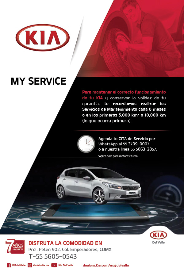 En Trascendencia Automotriz, S.A. de C.V. en lo sucesivo KIA DEL VALLE con domicilio en Ángel Urraza No. 1311, Colonia Del Valle, Delegación Benito Juárez, C.P. 03100, en México, Distrito Federal; le comunicamos que la información personal de todos nuestros clientes y clientes potenciales es tratada de forma estrictamente Confidencial, por lo que podrán sentirse plenamente seguros de que al adquirir nuestros bienes y/o servicios, hacemos un esfuerzo permanente para salvaguardarla y protegerla: i.Realizar los trámites, procedimientos y gestiones para la adquisición de bienes, productos y servicios para nuestros clientes y clientes potenciales. ii. Comercialización de vehículos automotores nuevos y seminuevos, así como toda clase de partes, refacciones y accesorios de vehículos automotores en sus diversas modalidades: contado, crédito y autofinanciamiento. iii. Otorgarle toda clase de bienes, productos y servicios para el mantenimiento de su automóvil (refacciones, hojalatería y pintura, servicios varios relacionados con vehículos automotores). Para conocer el texto completo del aviso de privacidad para clientes y clientes potenciales de KIA DEL VALLE favor de consultar aquí .