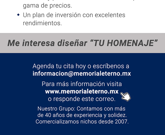 Aviso de Privacidad: En MEMORIAL ETERNO, S.A. DE C.V. en lo sucesivo ME con domicilio en Av. Insurgentes Sur 1231, Colonia Extremadura Insurgentes, C.P. 04370, Alcaldía Benito Juárez en la Ciudad de México la información de nuestros clientes y clientes potenciales es tratada de forma estrictamente confidencial por lo que al contar con sus datos personales consiente su tratamiento con las finalidades de realizar trámites, procedimientos y gestiones para la adquisición de bienes, productos y servicios y realizar actividades de mercadotecnia, publicidad y prospección comercial relacionadas y diversas a los bienes, productos y servicios de ME. Para conocer el texto completo del Aviso de Privacidad, favor de consultar en www.memorialeterno.mx. Si no desea recibir nuestros correos, delos de baja aquí.